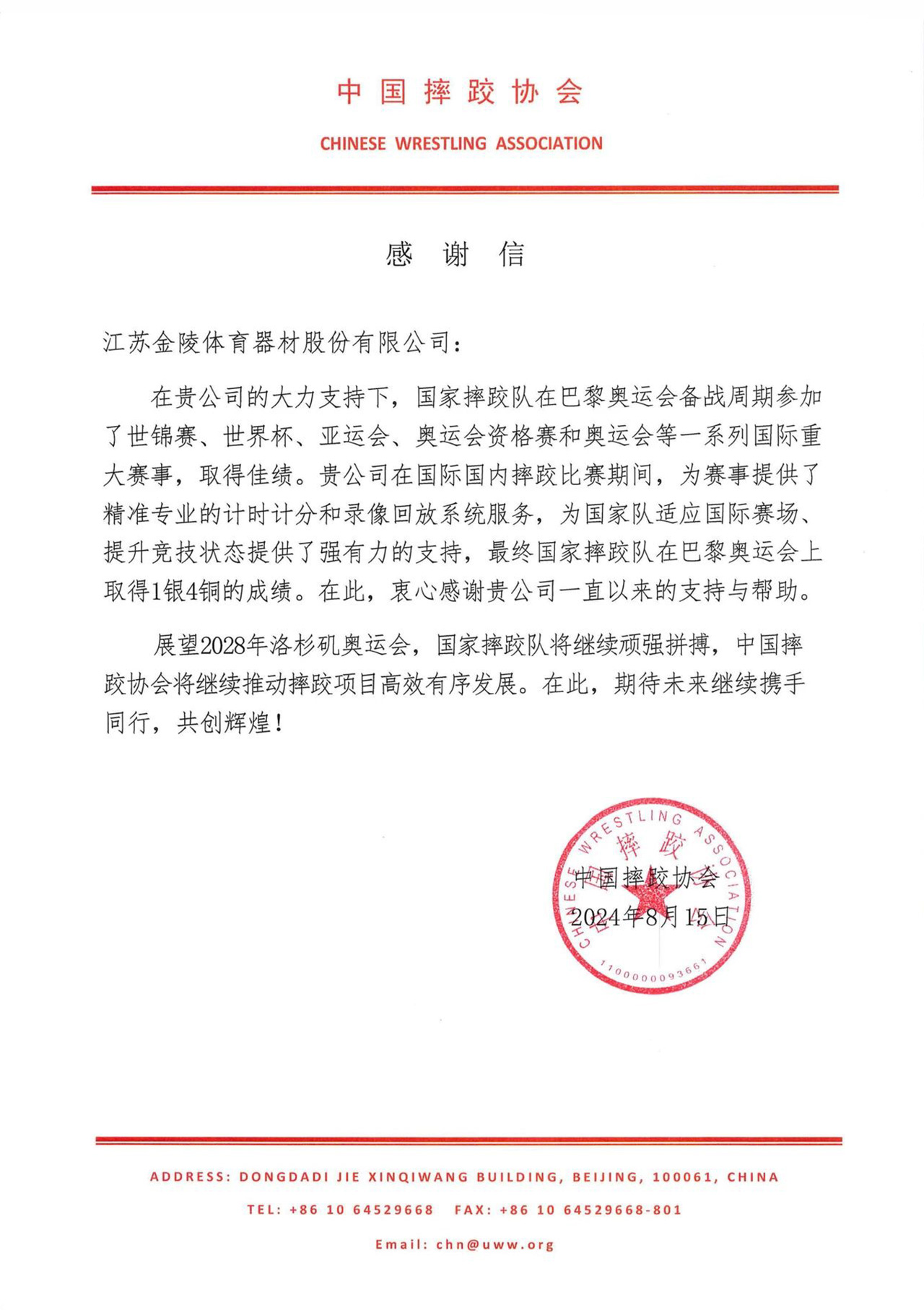信中說:在貴公司的大力支持下,國家摔跤隊在巴黎奧運會備戰(zhàn)周期參加了世錦賽、世界杯、亞運會、奧運會資格賽和奧運會等一系列國際重大賽事,取得佳績。貴公司在國際國內(nèi)摔跤比賽期間,為賽事提供了精準(zhǔn)專業(yè)的計時計分和錄像回放系統(tǒng)服務(wù),為國家隊適應(yīng)國際賽場,提升競技狀態(tài)提供了強有力的支持,最終國家摔跤隊在巴黎奧運會上取得1銀4銅的成績。在此,衷心感謝貴公司一直以來的支持與幫助。
