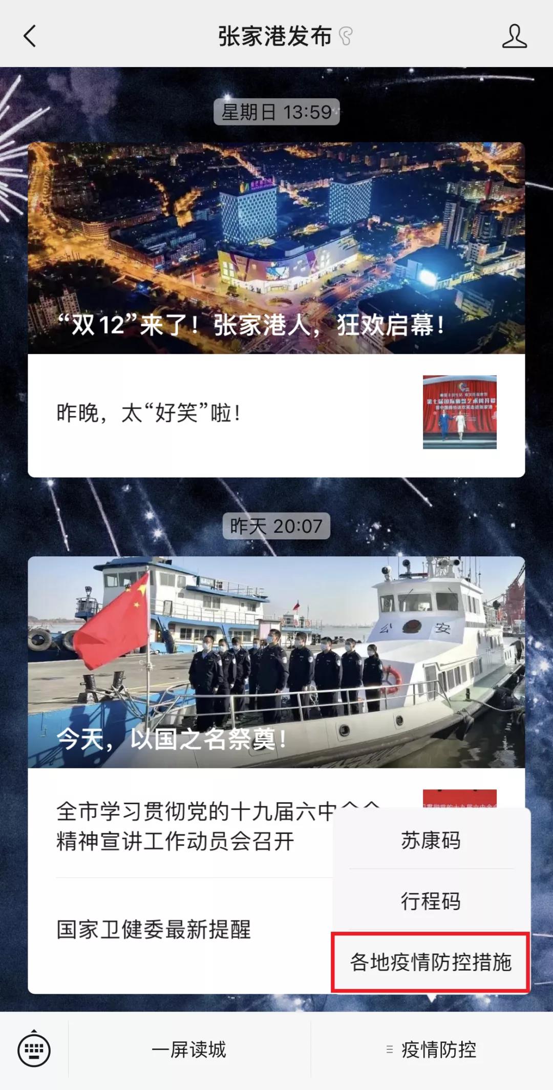 最近要出門,不知道出發(fā)地、目的地都有什么疫情防控政策措施?別著急,兩步教你查詢!在“張家港發(fā)布”微信菜單欄打開“國務院客戶端”小程序,進入后搜索“各地疫情防控政策措施”,即可搜索查詢相關信息!
